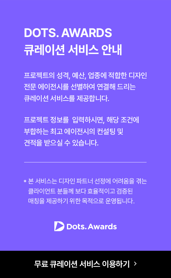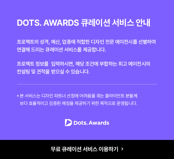 닷츠는 최고의 디자인 에이전시와 클라이언트를 실시간으로 연결하는 가장 젊고 영향력있는 플랫폼입니다. 또한, 매주 수상작을 선정하고 연말에는 최고의 심사위원단이 공정한 심사를 통해 한 해를 빛낸 최종 수상작을 결정합니다.